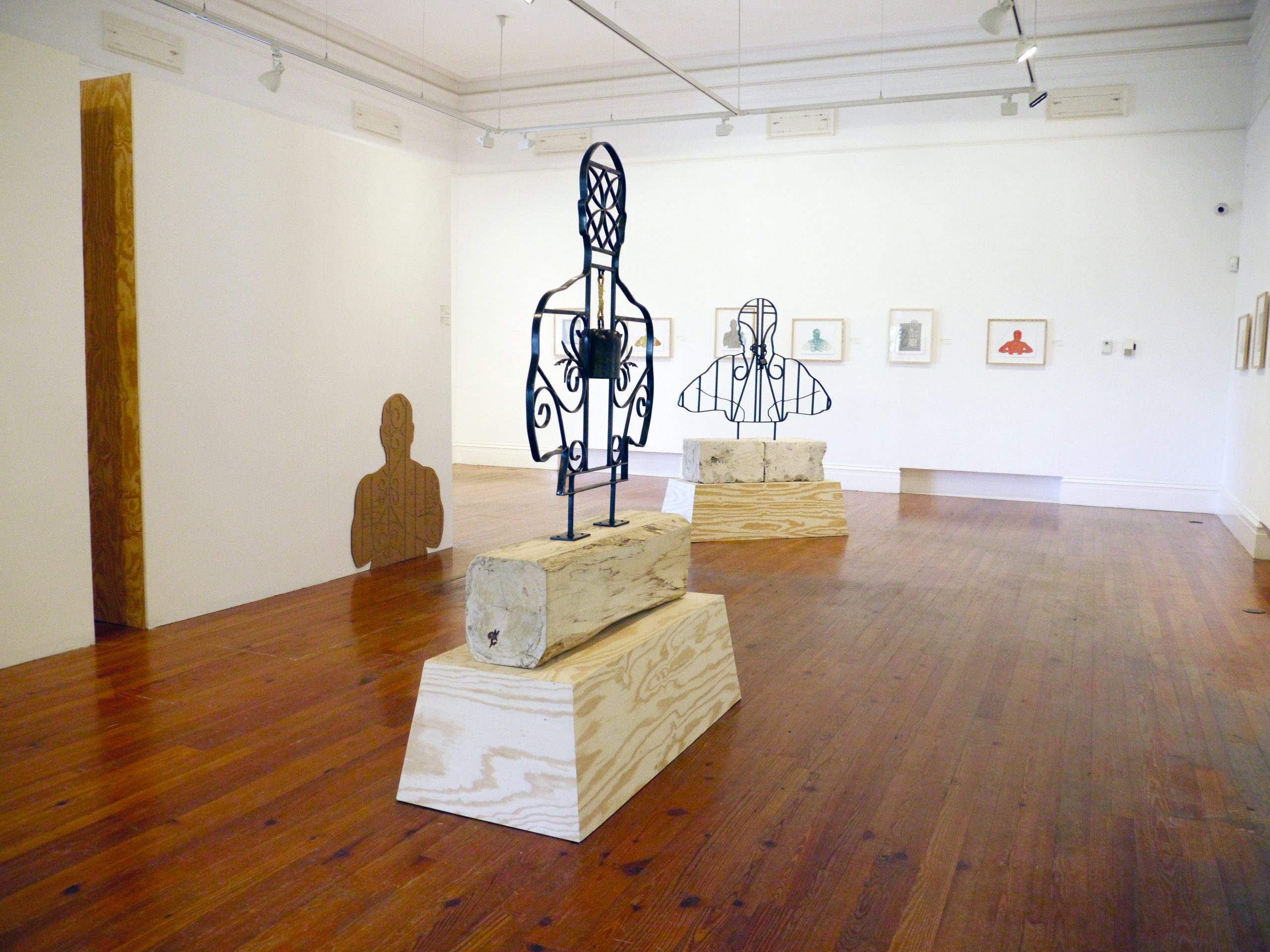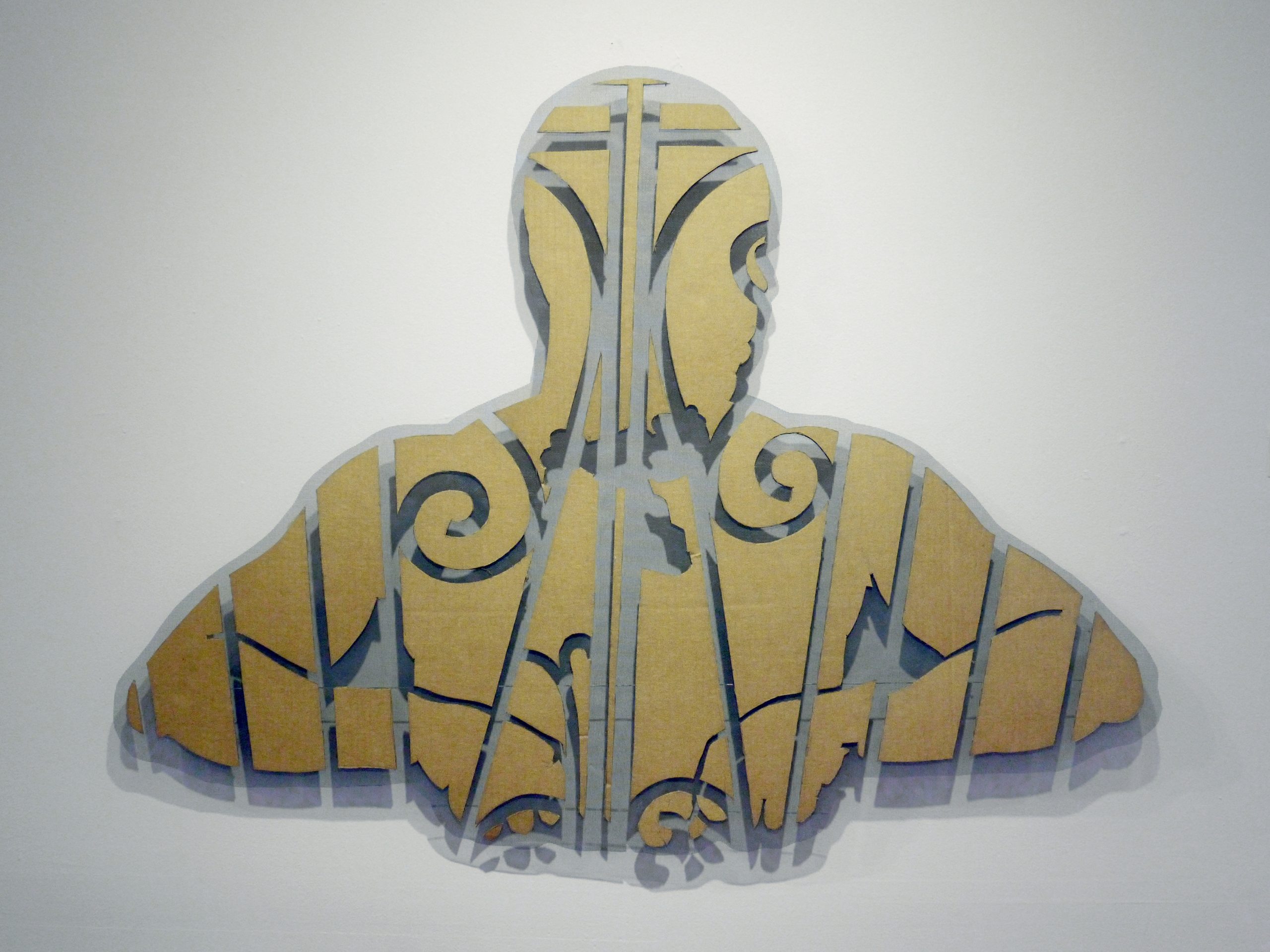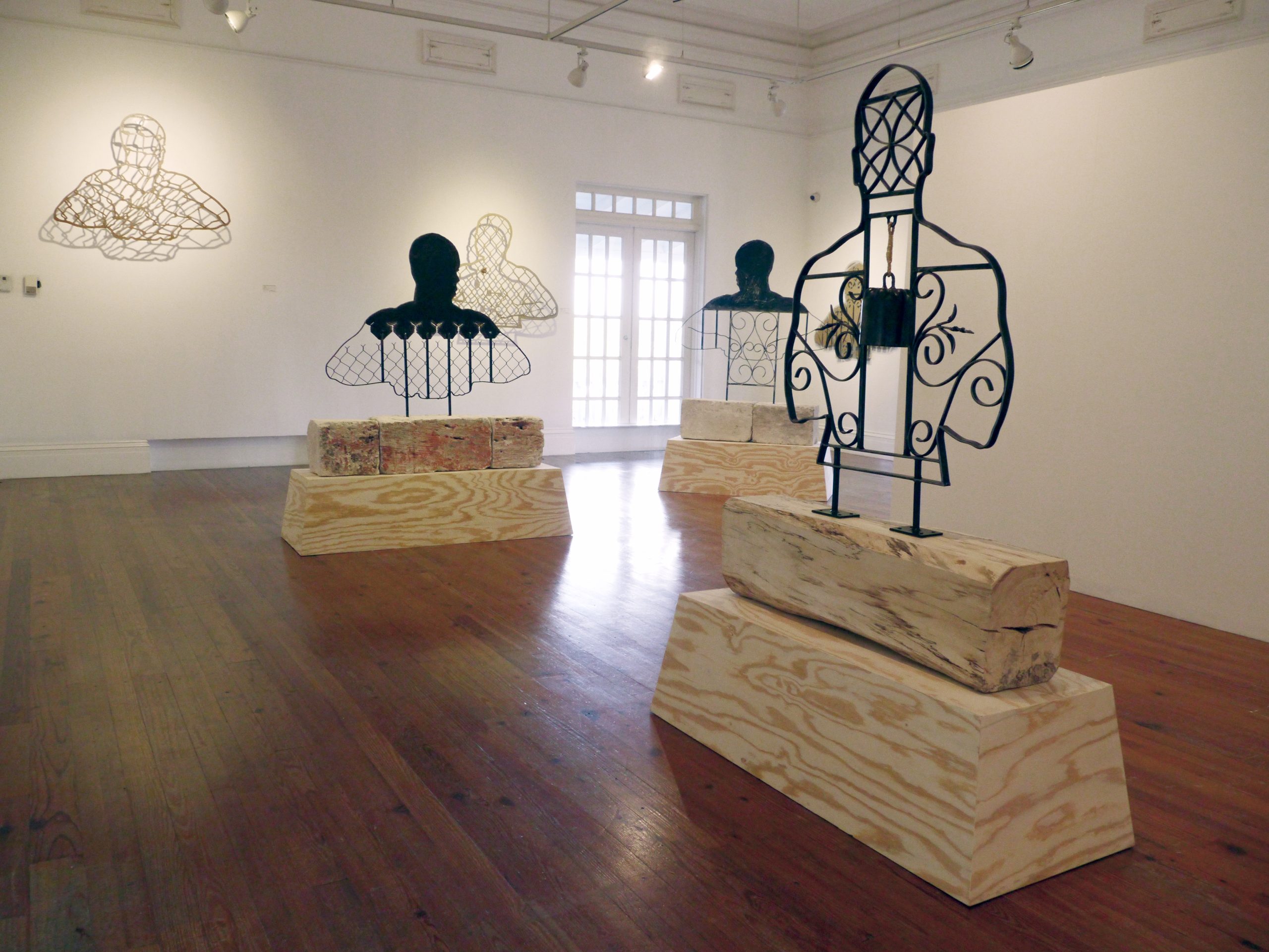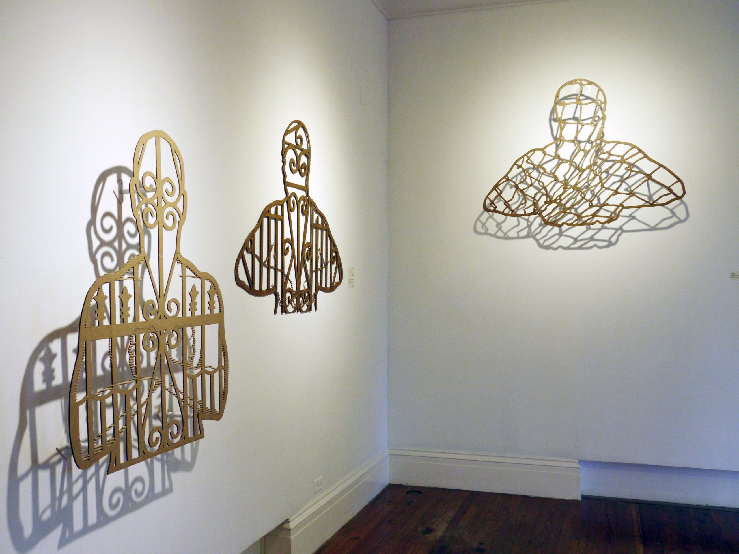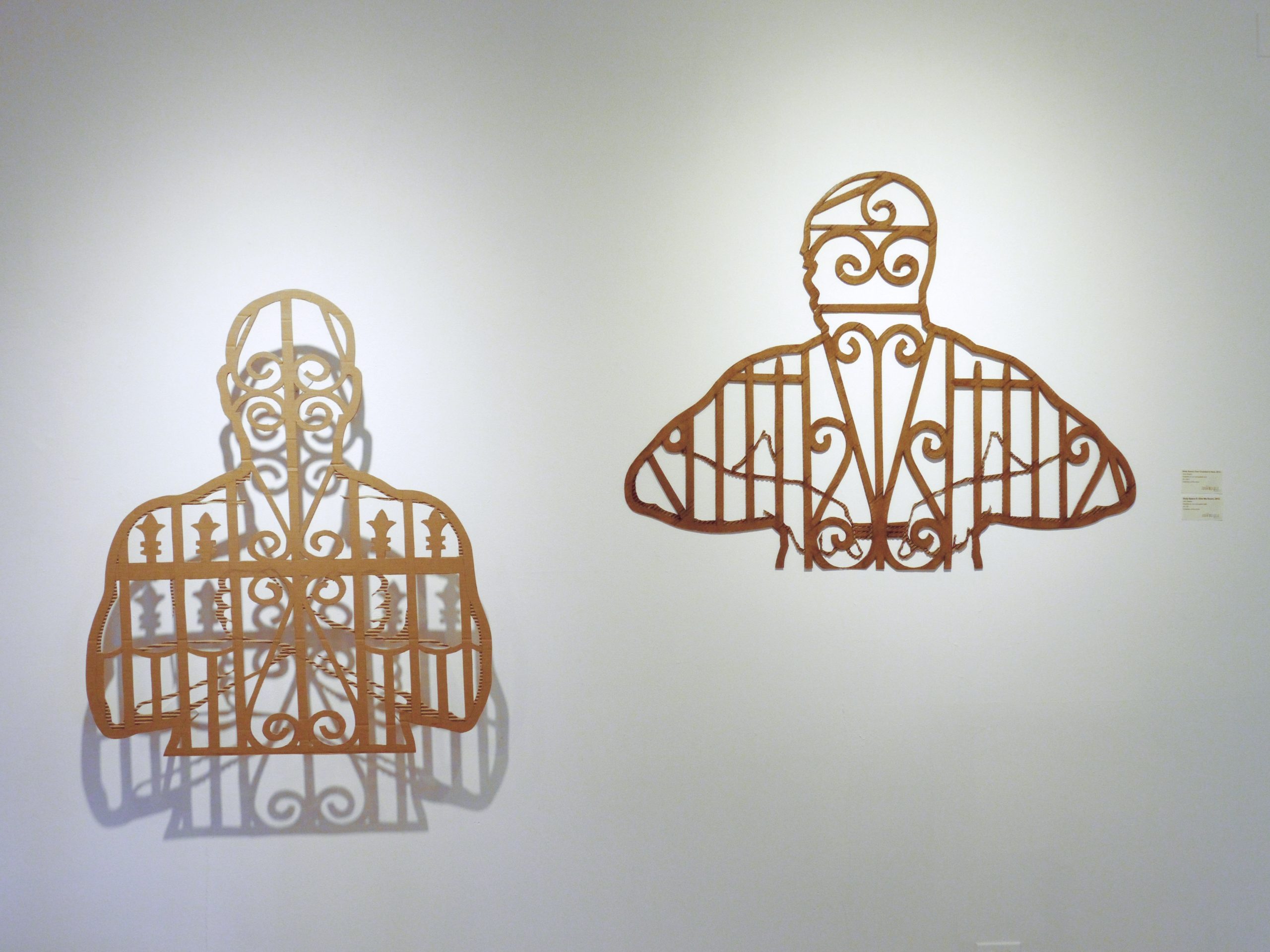 Installed in the Ballroom at NAGB, the exhibition features silhouetted human forms constructed from materials associated with domestic protection, including decorative metal security gates, mosquito netting, and chain-link fencing. Recalling the shapes of paper shooting targets, the figures create an uneasy interplay between vulnerability and defence. Some silhouettes appear embedded within metal grilles but are in fact made from cardboard, suggesting the fragility of perceived security. The installation considers how physical barriers influence relationships between neighbours and reflect broader psychological divisions between “us” and “them.”